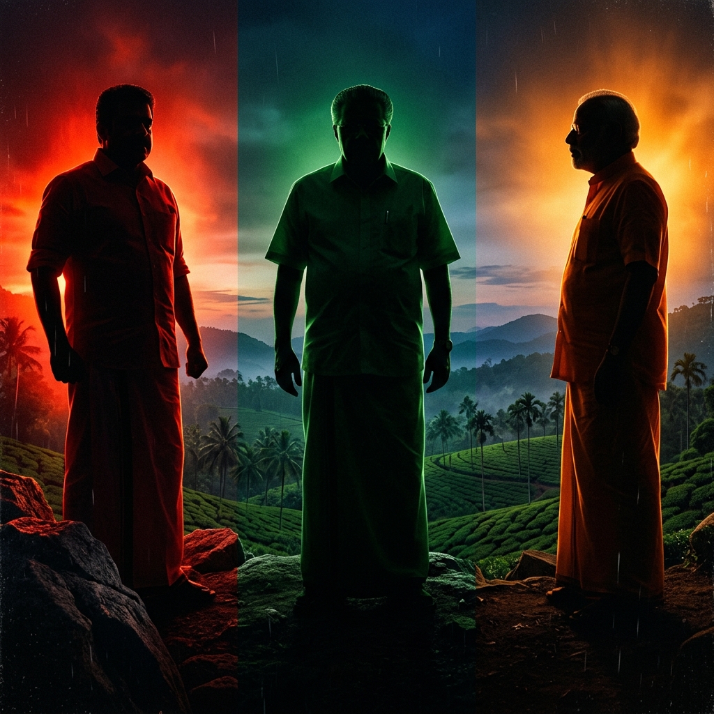 A three-way collision. Red, Green, and Saffron political forces collide across Kerala heading into May 2026.