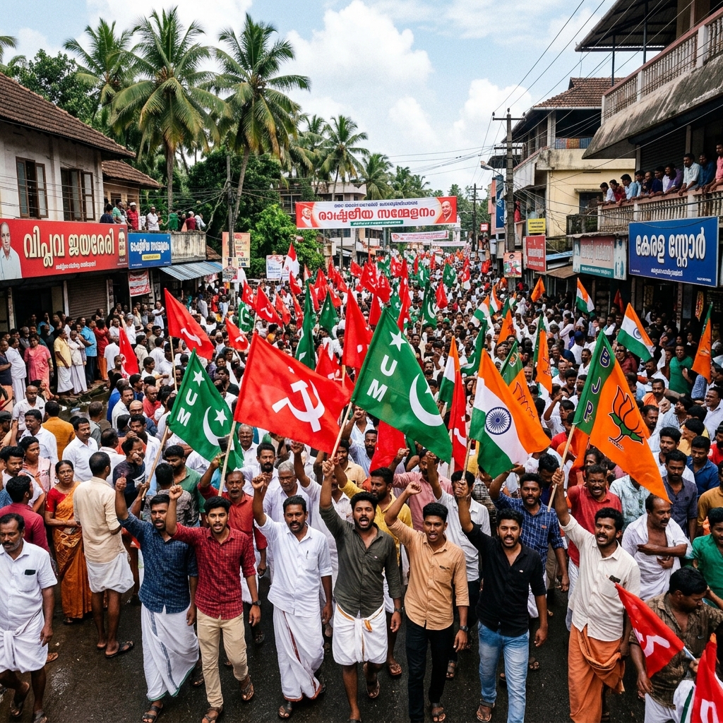 Thousands gather waving fractured party flags, demonstrating the hyper-competitive three-way breakdown overtaking major cities like Palakkad and Thrissur.
